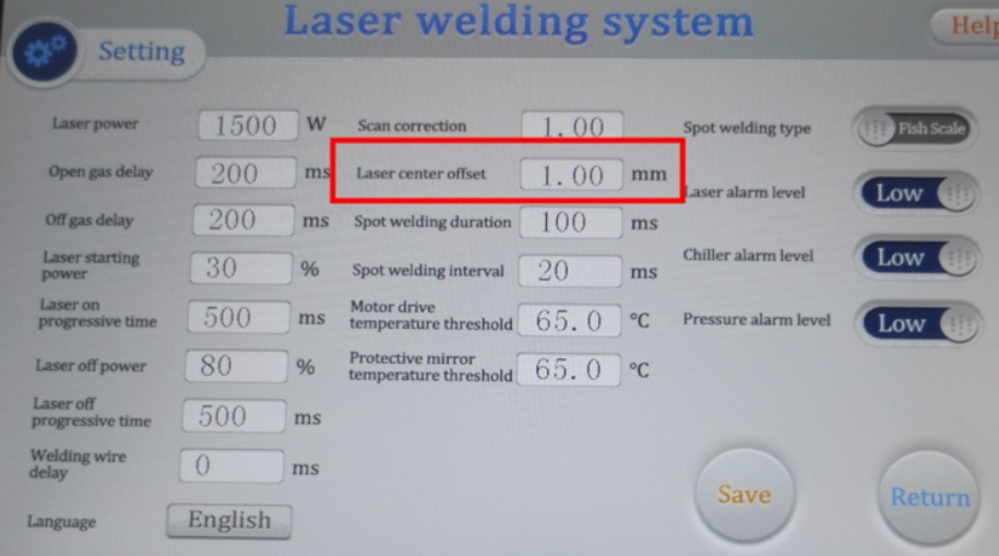 Mettez la distance correspondant au décalage dans « Laser center offset » et ajustez en surveillant les changements de positions du point rouge.